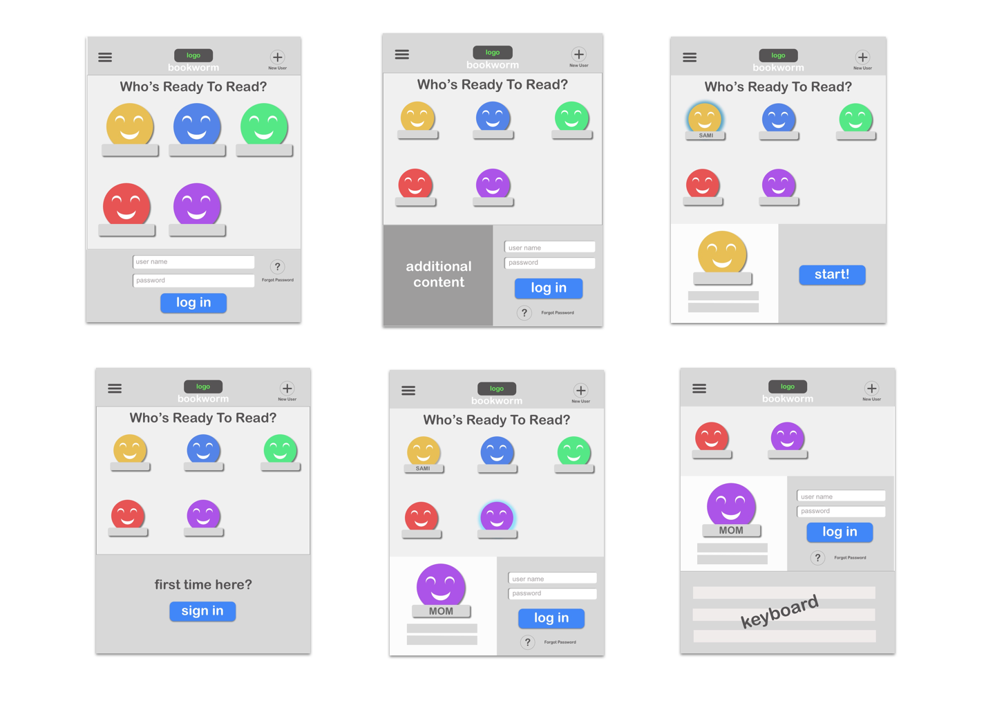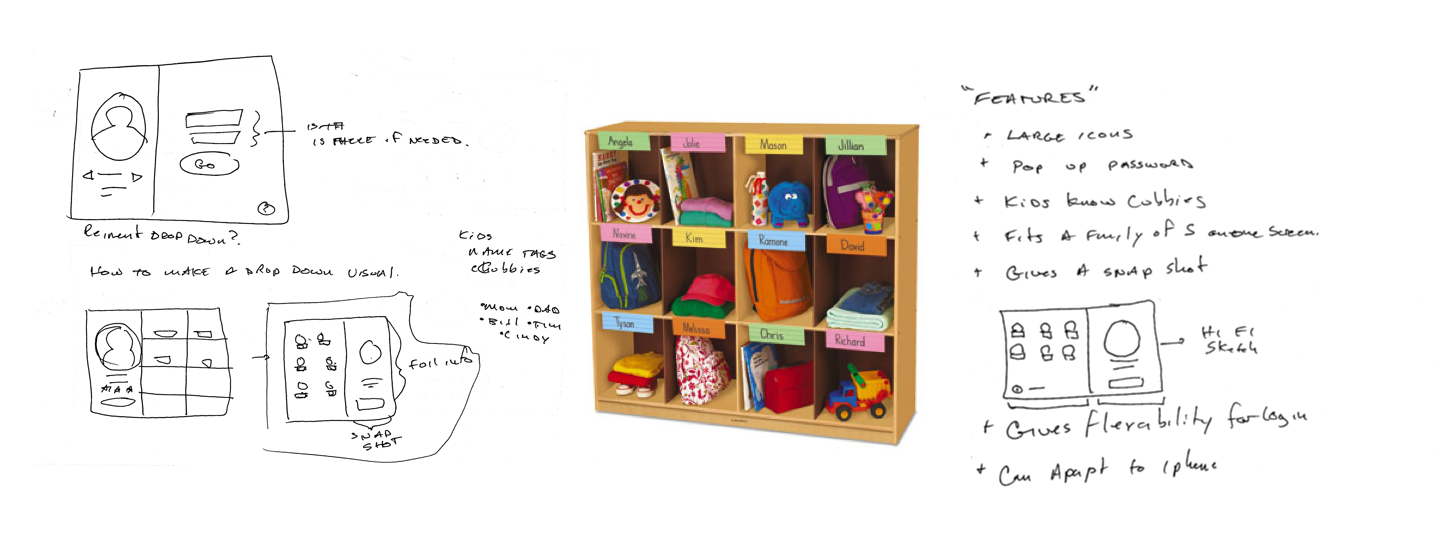How to make a menu visually appealing and relatable to children ages 3- 10? I asked myself if I could reinvent the drop down menu, or how to make it more visual. I came up with the idea to lay out icons in a grid format with user names under them because that is how I first remembered how to identify as things being "mine". Cubbies, bins, or coat hooks with names are all ways teachers and parents personalize things for children to help keep organized. This is the idea I grabbed onto when thinking about how to present a list of users.