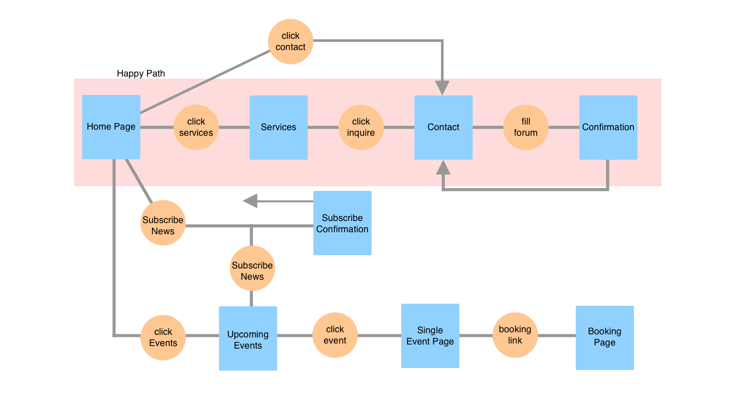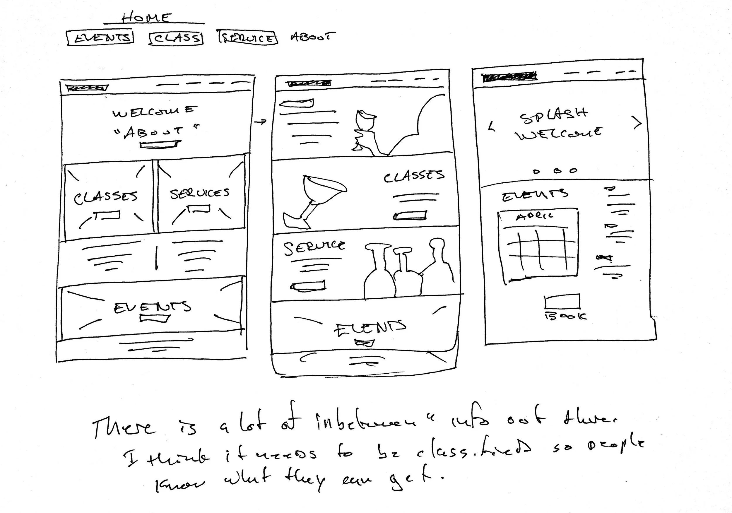 In person interviews were conducted with the stakeholder to understand their goals. A competitive analysis was conducted among other businesses with similar offerings. Designs were also brought in that captured the desired "look" the client wanted.