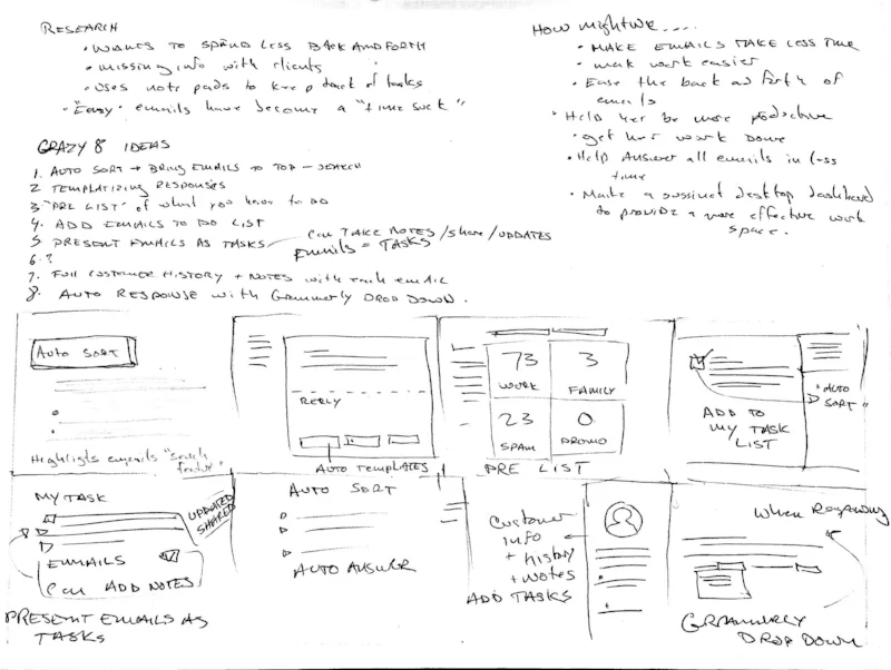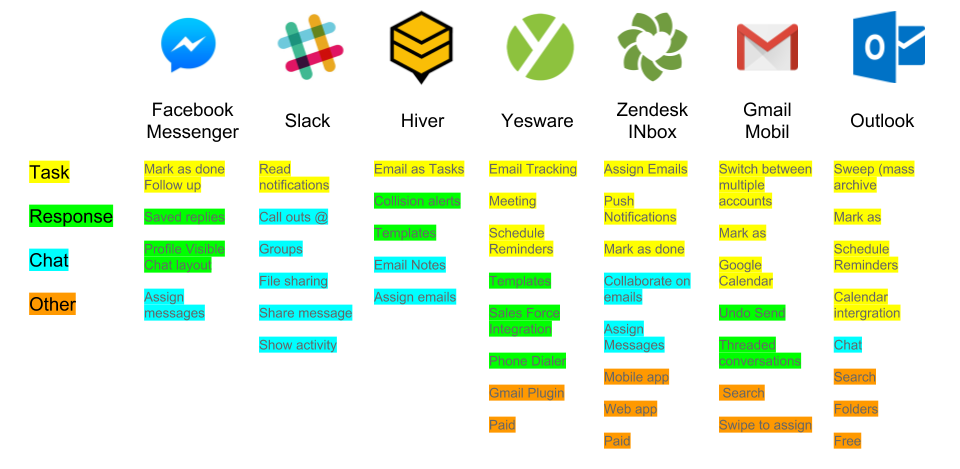 For the competitive analysis I looked at some of the current options that are available to employees who have to sort through large amounts of emails. Based on first hand use and research, I made some rough groupings of features to find common trends as well as opportunities for features and solutions to our users problem.